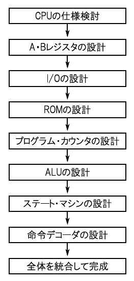 図1に,本技術解説シリーズの流れを示します.最初にCPU全体の仕様を決めます.これは,アーキテクチャや命令セットを検討する作業になります.その後,「ROM」,「レジスタ」,「I/O」,「プログラム・カウンタ」,「ALU」,「ステート・マシン」,「命令デコーダ」といった各機能ブロックの設計を行います.基本的に,簡単な回路から難しい回路の順に解説していきます.最後にすべての回路を統合してCPUとしてまとめ上げます.