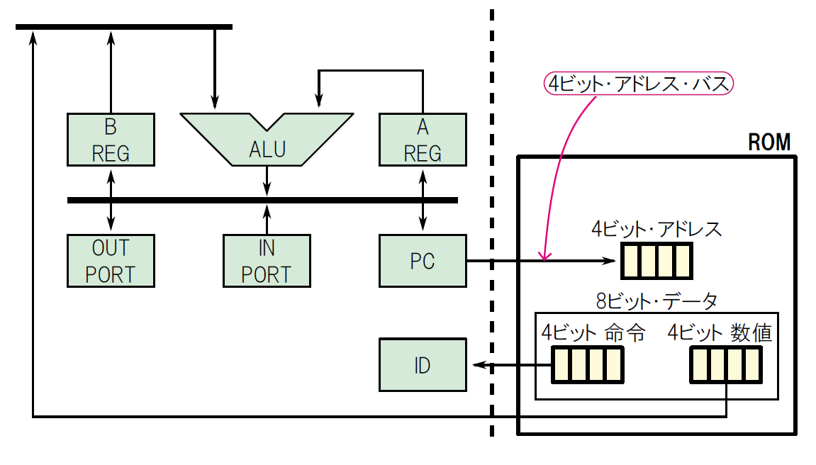 ROMを加えた全体のアーキテクチャを図7に示します.ROMのアドレス入力は,プログラム・カウンタの出力に接続されています.このように,アドレスの信号が流れる配線のことを「アドレス・バス」(address bus)といいます.