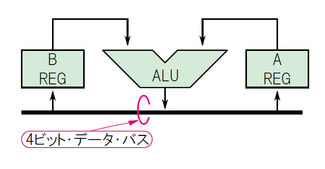 なお,ALUに対する入力経路には「マルチプレクサ」(multiplexer:MUX)を挿入して,“0”(4ビットすべてが“0”レベル)を入力できるようにしています.これは,「A REGの内容だけをALUから出力する(B REG側を“0”にする)」あるいは「B REGの内容だけをALUから出力する(A REG側を“0”にする)」とった動作を実現するためのものです.この機能は,後で出てくる「A REGの内容をOUT PORTに出力する」などの命令を実行する際に使われます.