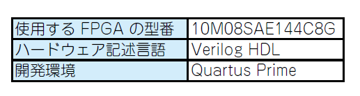 また,FPGAの開発環境はインテル社から無償で提供されている“Quartus Prime”を使います.FPGAに関する情報をまとめて表Aに示します.