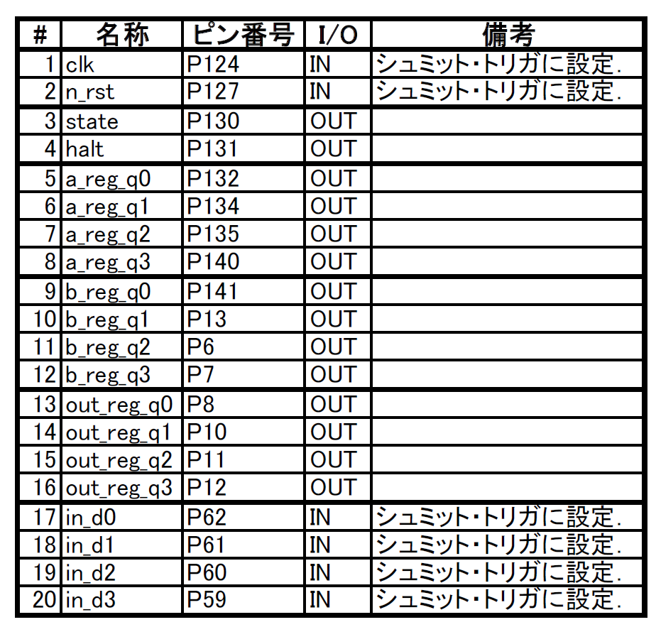 表B FPGA実験基板用のピン設定