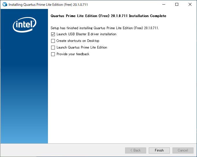 Quartus PrimeとModel Simのインストールが完了すると,図10の画面が表示されます.引き続き“USB Blaster”(書き込み器)のドライバをインストールするので,一番上の“Launch USB Blaster II driver installation”にチェックを付けます.他にもオプション(デスクトップにショートカットのアイコンを作るなど)があるので,お好みでチェックをつけてください.[Finish]をクリックすればインストール完了です.