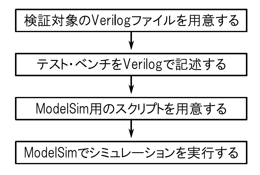 ModelSimにおけるシミュレーションは,必要なVerilogファイル(検証対象のモジュールやテスト・ベンチ)の読み込み,Verilogファイルのコンパイル,シミュレーションの実行処理,波形表示の設定など,数段階の手順を踏んで行われます.