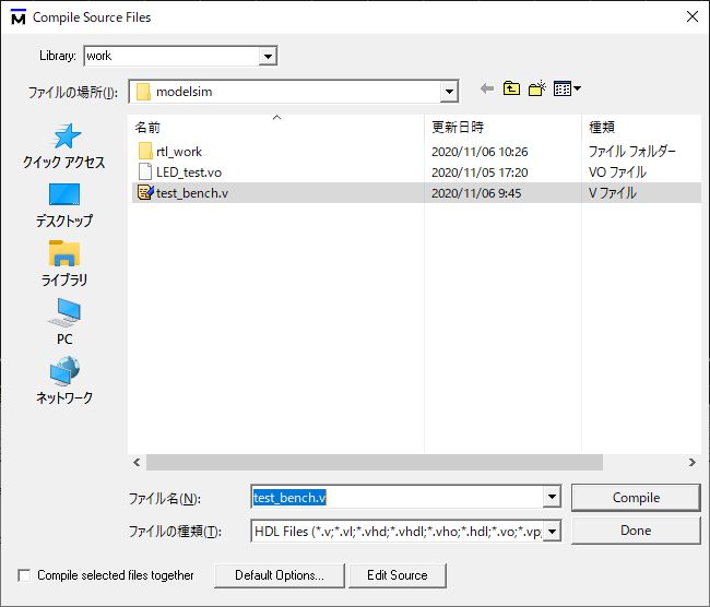 “-work”は論理ライブラリの名前を指定するオプションです.今回は先に“work”という名前で“rtl_work”フォルダと対応づけておいた論理ライブラリを使います.