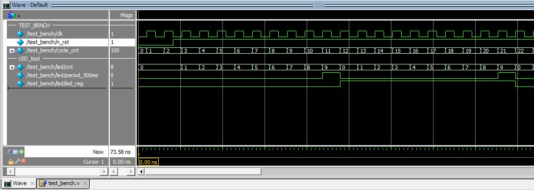 今回は“LED_test”モジュール(インスタンス名は“led”)内の“cnt”レジスタの値が“9”になったところで“period_500ms”の信号線が“1”になるようになっています.また,“period_500ms”が“1”になるたびに“led_reg”の出力が反転することを確認してください.