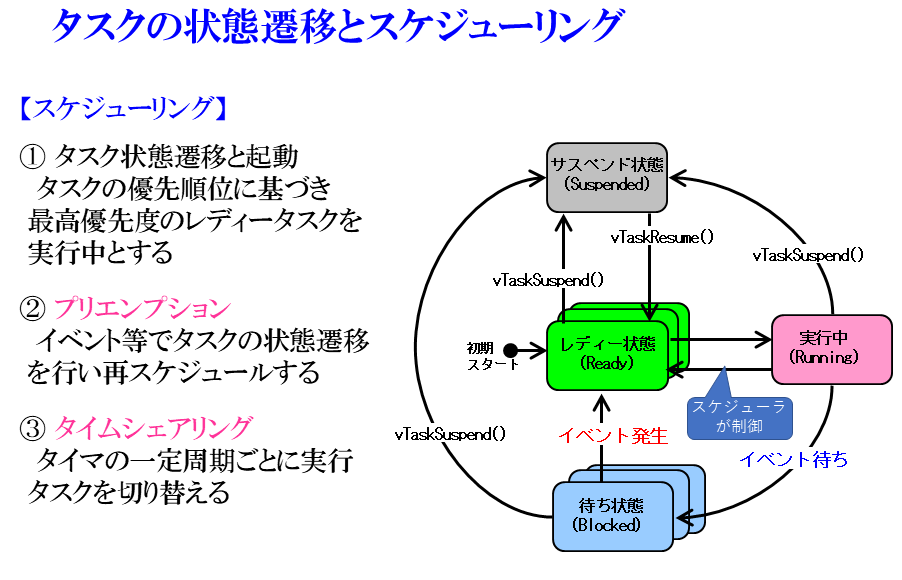 図1 一般的なリアルタイムOSのタスク状態遷移とスケジューリング