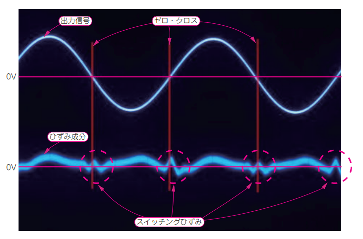 出力信号が$0mathrm{V}$付近(ゼロ・クロス)にあるときに発生するひずみで,うねるような形をしています.これを「クロスオーバーひずみ」といいます.