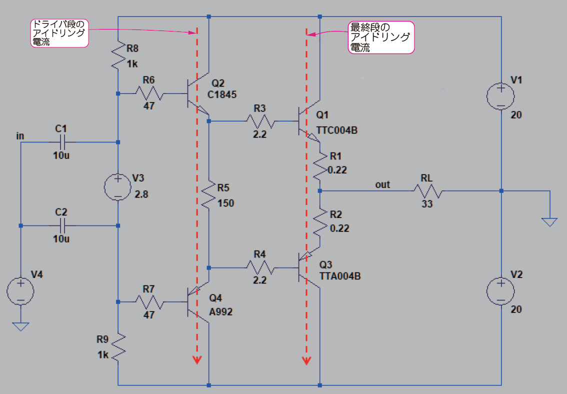 バイアス電圧が一定と仮定すると,アイドリング電流を出力電流のピークの半分に設定すれば,全出力電圧に対して,SEPP回路の上下のトランジスタがOFFしなくなります.