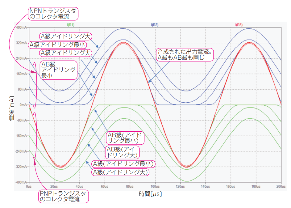 同じく出力信号がゼロ・クロス付近にあるとき,B級やAB級のプッシュ・プル回路では,NPNトランジスタとPNPトランジスタの両方がOFFして,アイドリング電流がゼロになります.