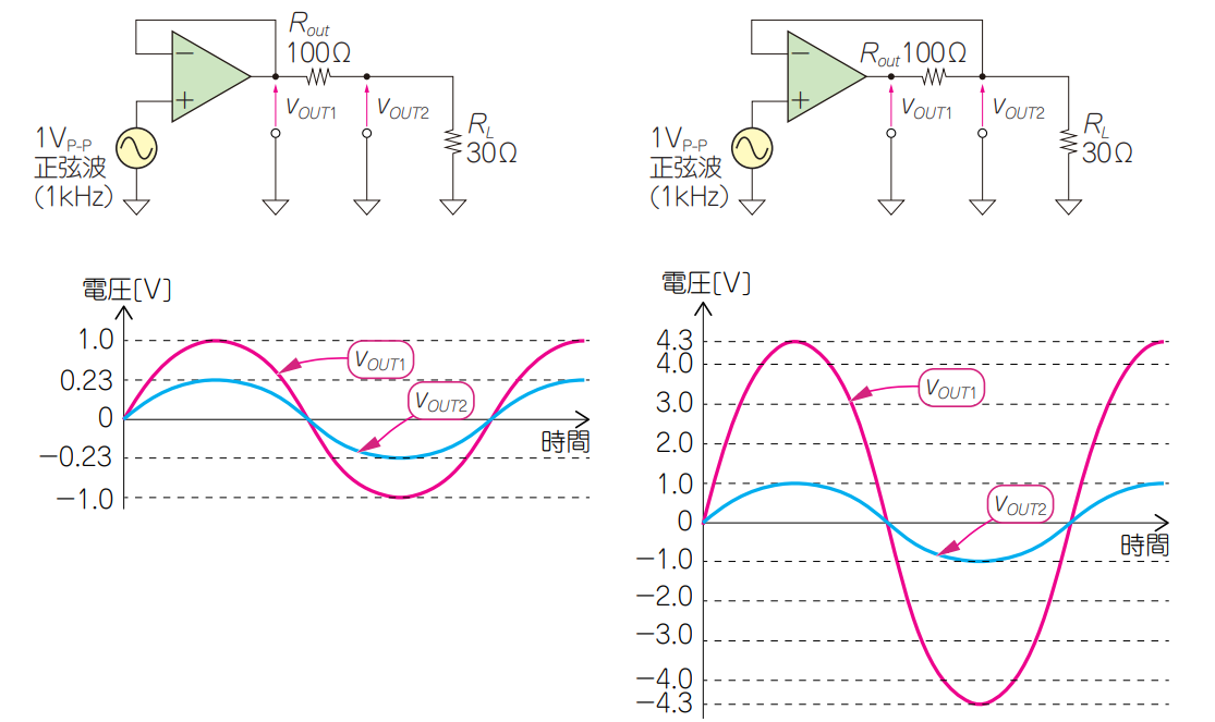 多くのアンプは,負帰還をたくさんかけることで出力インピーダンスを下げ,スピーカを制御しています.図7は,負帰還の効果によって,アンプの出力にある$100mathrm{Ω}$の出力電圧振幅への影響がなくなることを示しています.$100mathrm{Ω}$が帰還ループの外側にある図7(a)の接続では,負荷に加わる電圧($V_{mathrm{out2}}$)は,$30Ω/(100mathrm{Ω}+30mathrm{Ω})=0.23$倍に減衰します.$100mathrm{Ω}$を帰還ループの内側に入れると[図7(b)],OPアンプの出力電圧($V_{mathrm{out1}}$)は$4.3mathrm{V_{peak}}$に,負荷には入力電圧と同じ$1mathrm{V_{peak}}$が加わります.負帰還によって100Ωの抵抗をなかったことにできる効果は素晴らしいですが,OPアンプは無駄に増幅しているとも理解できます.裸の出力インピーダンスが低ければ,アンプの電圧増幅段は無駄な仕事をせずにすみます.