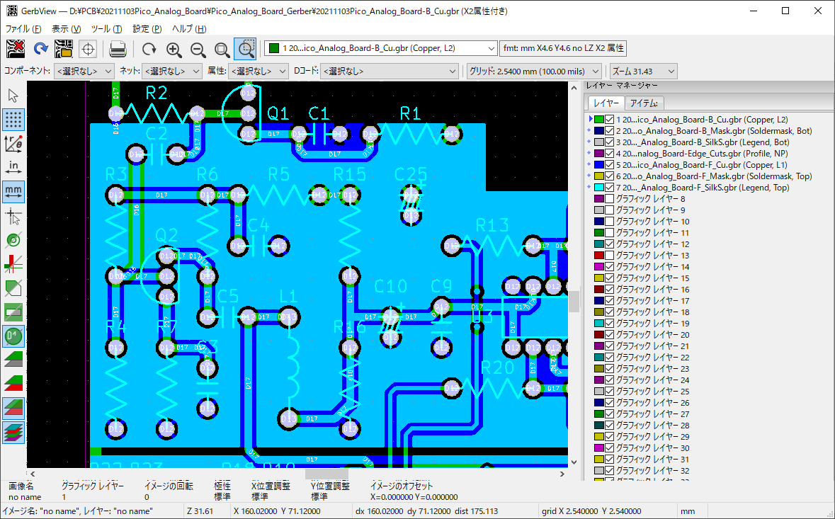 レイアウトの作業が完了したら,プリント基板の製造用データである「ガーバ・データ」を出力します.KiCadにはガーバ・データの内容を確認するための“Gerb View”というソフトウェアが付属しているので,基板メーカにガーバ・データを提出する(これを「出図」という)前に念入りに確認しておくことをおすすめします(図7).