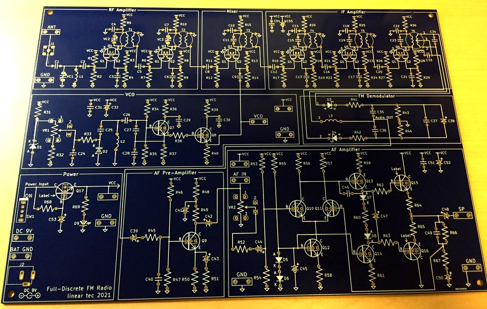 写真3 基板上のシルク(白いライン)ですべての回路図を描いたFMラジオ基板の例