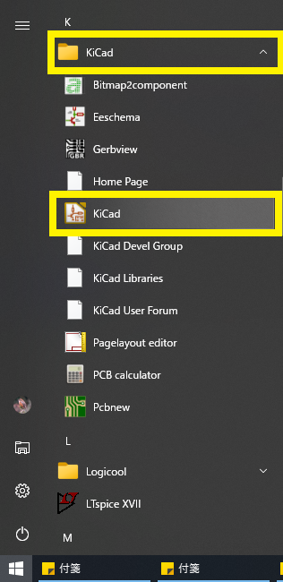 図19 Windowsスタート・メニューからKiCadを起動する