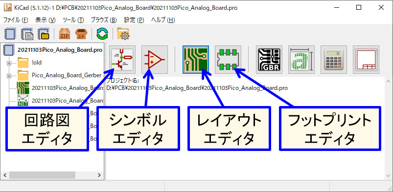 KiCadを起動すると図20の画面が表示されます.ここではテスト用に,ダミーのプロジェクトを作ってみましょう.[ファイル] – [新規] – [プロジェクト] をクリックして,適当なディレクトリに好きな名前でプロジェクトを作ってください.すると図20のように各アプリケーションを起動するボタンが有効になります.1つ1つクリックしてみて,問題なく起動することを確認してください.