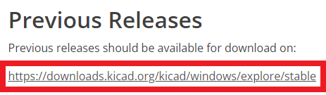 今回は過去に配布された“KiCad 5.12.1”を利用するので,画面をすこし下にスクロールして“Previous Releases”という項目を探します(図10).この部分のリンクをクリックすると,ダウンロード可能なKiCadの全インストーラを参照できるWebページに移動します.