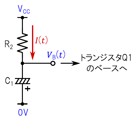 図9のように,トランジスタQ1のベースに接続されているR2とC1の回路を抜き出して考えます.なお,OFF状態のトランジスタのベースに流れ込む電流は十分に小さいものとして無視します.