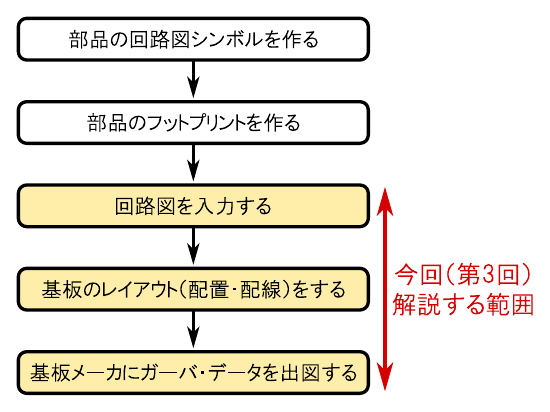- 今回は回路図の入力から基板設計データの出図までを扱う