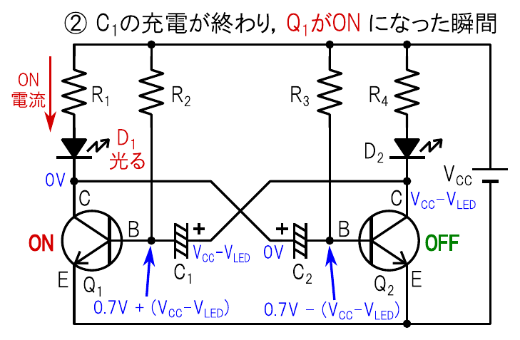 このとき(少なくとも一瞬の間は)C2の両端の電位差は直前の“$ 0.7 \mathrm{V} – (V_\mathrm{CC} – V_\mathrm{LED})$”のまま保持されるので,Q1のコレクタ電圧が0Vに「落ちる」ことによって,Q2のベース電圧は元の“0.7 V”から“$ 0.7 \mathrm{V} – (V_\mathrm{CC} – V_\mathrm{LED})$”(負の値)まで急激に変化します.これによってQ2はOFFし,Q2のコレクタ電圧は“$V_\mathrm{CC} – V_\mathrm{LED}$”になります.