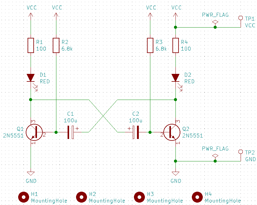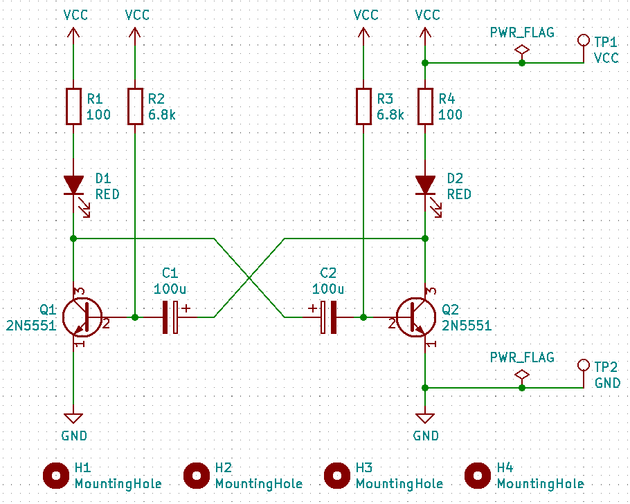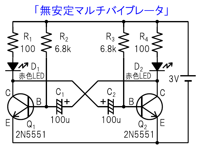 これから作るプリント基板の題材は,図4に示す「無安定マルチバイブレータ」(astable multi-vibrator)という回路です.この回路は3 Vから6 V程度の電源電圧で動作し,3 V電源で動かした場合は2つのLEDがおよそ0.5秒の周期(2 Hz)で交互に点滅します.