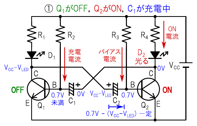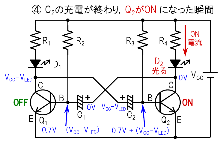 ここで生じる現象は,最初に説明した「Q1がOFFで,Q2がON」の時と基本的に同じで,Q1側とQ2側の関係が逆になっただけです.この状態ではR3を通してC2に充電電流が流れ込み,徐々にQ2のベース電圧が大きくなっていきます.そしてQ2のベース電圧が0.7V程度になりQ2がONすると,次の「ステップ4」に進みます.