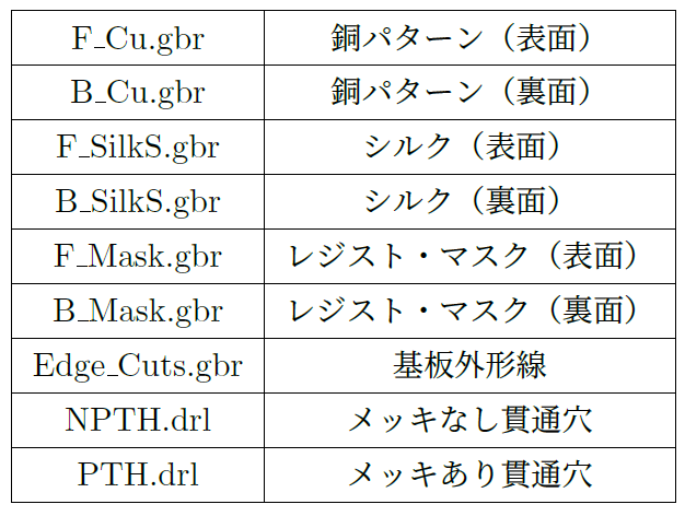 今回は表10に示す7つのレイヤのデータと2つのドリル・データを合わせた合計9個のファイルを“Gerber”というディレクトリに保存し,このディレクトリを圧縮した.zipファイルをアップロードしました.なお,表10ではレイヤ名と拡張子だけを表記していますが,実際のファイル名にはプロジェクトの名前も入っています.