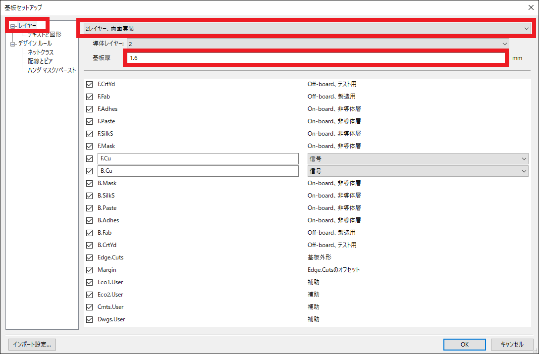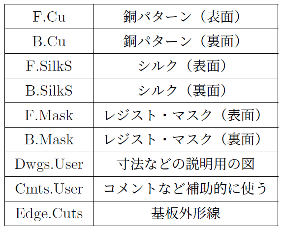「出力フォーマット」の項目では「ガーバー」を選択し,「含まれるレイヤー」の項目では銅箔レイヤの“F.Cu”と“B.Cu”,シルクの“F.SilkS”と“B.SilkS”,レジスト・マスクの“F.Mask”と“B.Mask”,基板外形線の“Edge.Cuts”の合計7レイヤを選択します.