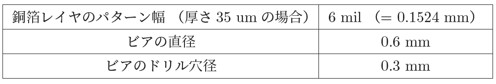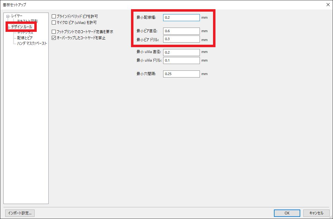 「最小パターン幅/間隔」では,デフォルトの“6/6mil”とします.“6 mil = 0.1524 mm”なので,今回設定したデザイン・ルールであれば製造時のトラブルはありません.また,最小穴径(ビアを含めたPTH/NPTHのドリル径)もデフォルトの“0.3 mm”とします.