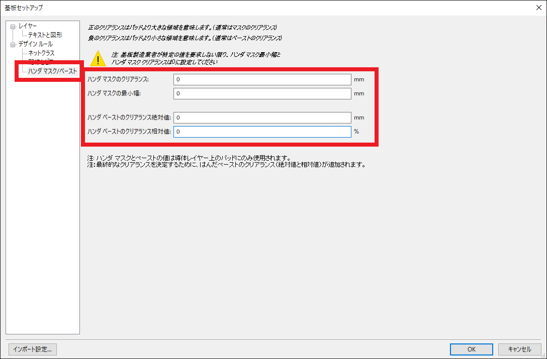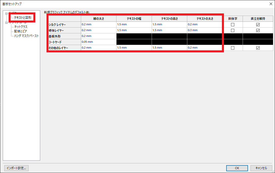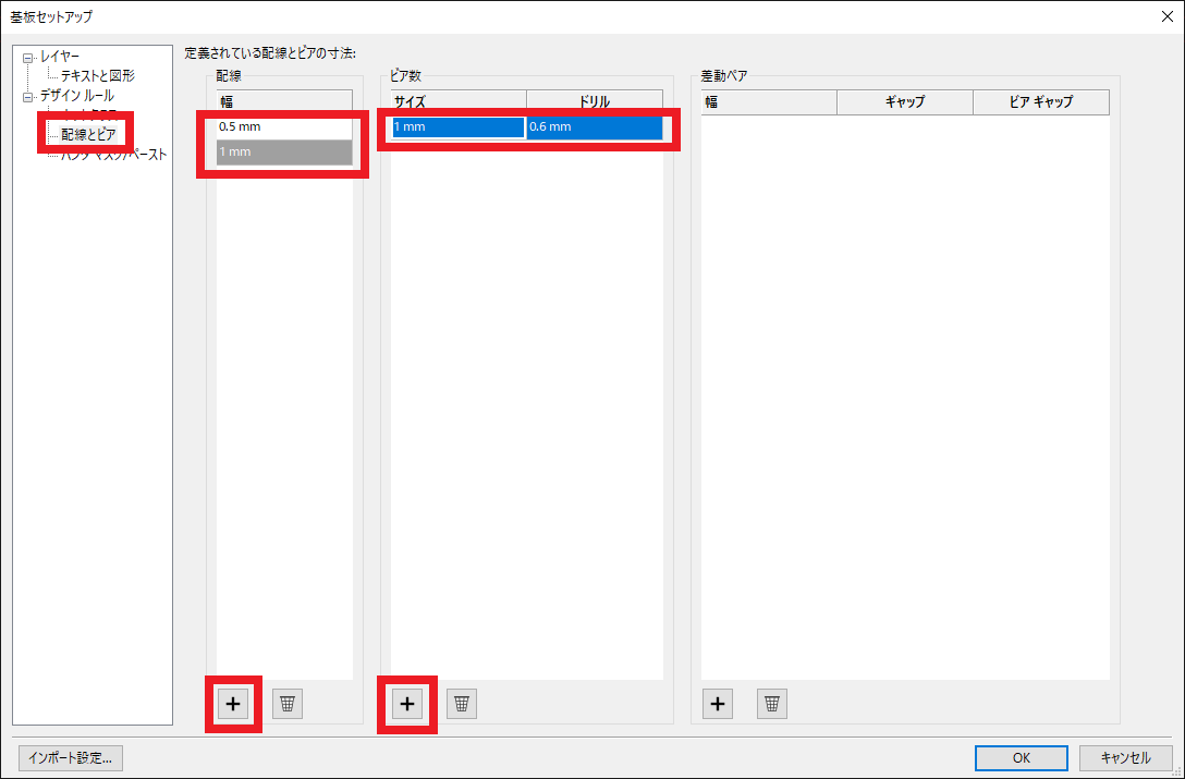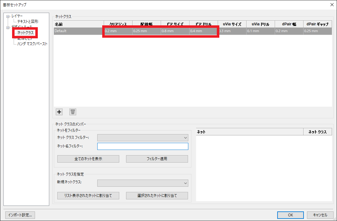 図132の画面では,ビアやパッド用のドリル・データの設定を行います.基本的にデフォルトのままで問題ありませんが,もし基板製造メーカから特別な指示がある場合は,それに従ってください.