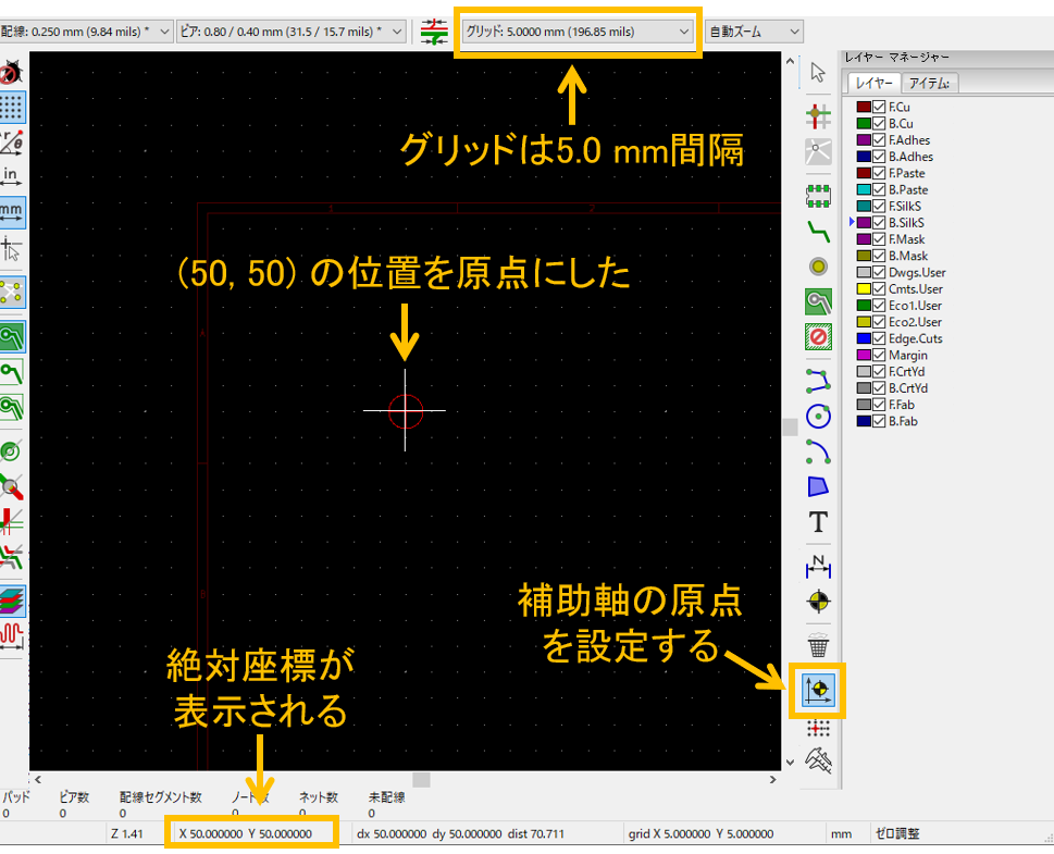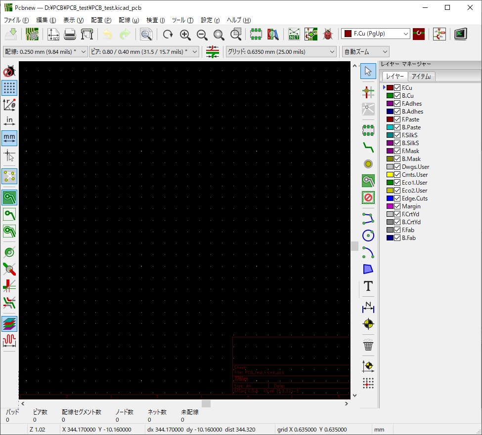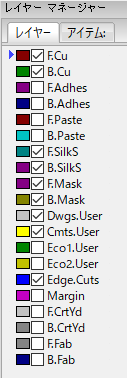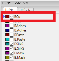 まずは表面の配線パターンを描きます.図101のように,「レイヤー マネージャー」で“F.Cu”を選択します.この状態でキーボードの [x] を押すと,その地点からパターンの描画が始まります.