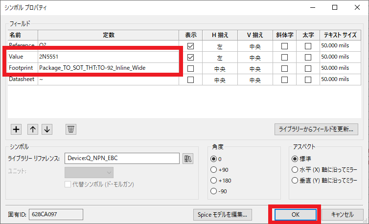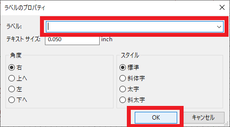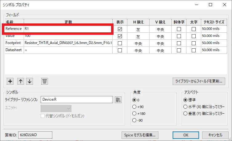 シルクの上にマウス・カーソルを合わせて [e] キーを押すと,プロパティが表示されます.ここでシルクの文字や大きさなどを調整します.また,シルクの上にマウス・カーソルを合わせて [r] キーを押すと回転できます.