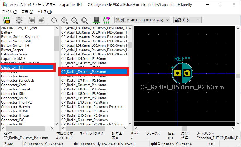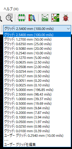 部品のフットプリントを配置するときは,できるだけグリッド間隔を統一するとレイアウトが崩れにくくなります.電子部品のピッチは基本的にインチ単位なので,部品の配置や配線の工程ではメートル単位よりもインチ単位のグリッド間隔をおすすめします.特に,今回のようにスルーホール系の部品を扱う場合は,グリッド間隔を“2.54 mm”にするとユニバーサル基板に近い感覚でレイアウトできます.“2.54 mm”で粗すぎると感じたら“1.27 mm”,それでも粗いなら“0.635 mm”といった具合に少しずつ細かくしていきます.