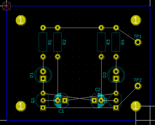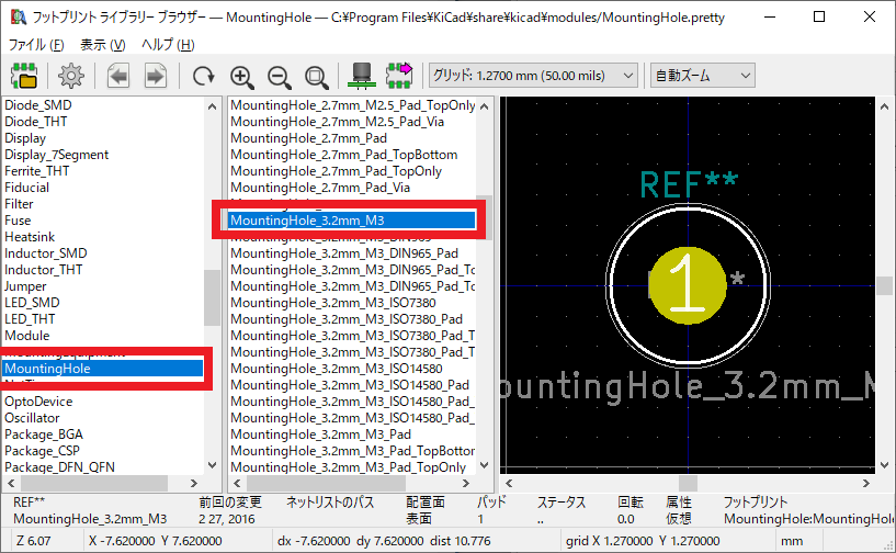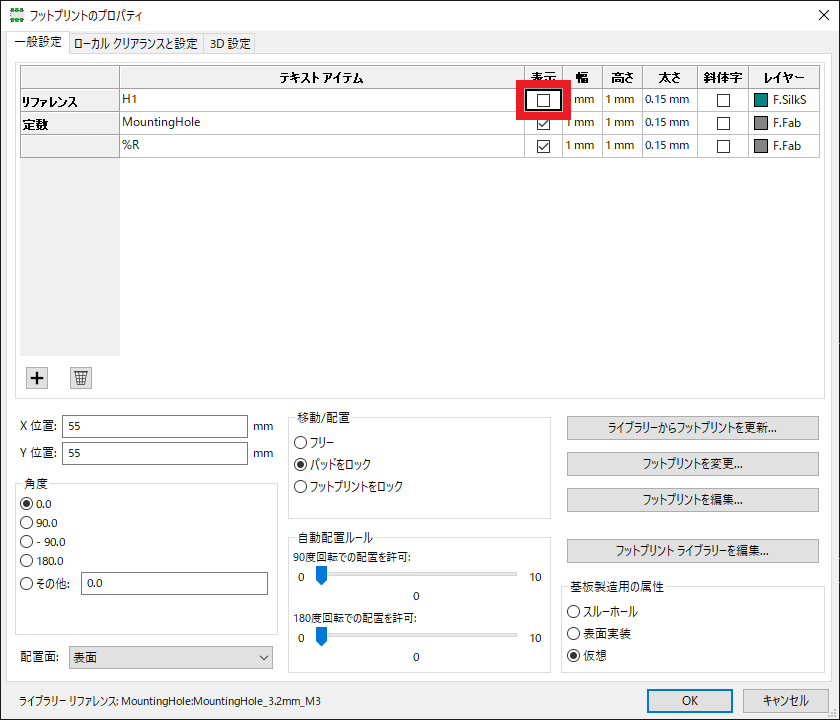 ネジの取付穴を配置します.今回は取付穴のフットプリントとして“MountingHole”を使っていますが,この場所に電子部品を取り付けるわけではないので,リファレンス番号のシルク(“H1”から“H4”)を非表示にしておきます.