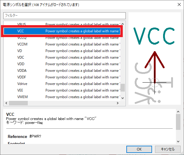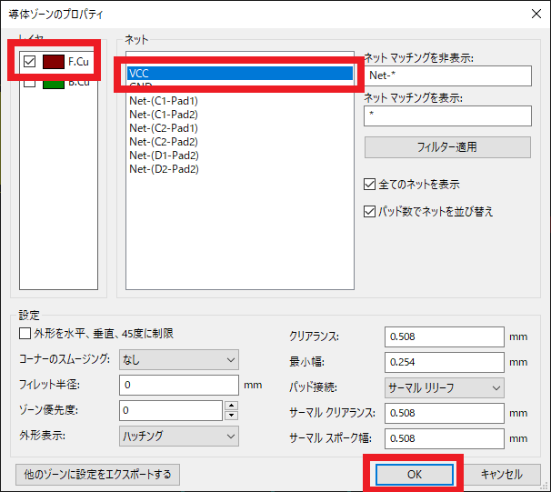 図111の画面が表示されたら,「レイヤ」の欄で“F.Cu”にチェックが付いていることを確認し,「ネット」の欄で“VCC”を選択します.なお,ここで表示されるネット名は回路図を作った時のネット名に対応しています.回路図入力の際にノードにラベルを付けておくと,ここで表示されるネット名がわかりやすくなります.[OK] をクリックして,次の操作に進みます.
