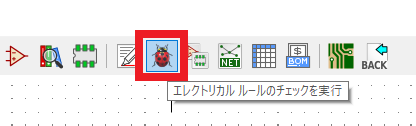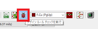 KiCadの場合は,これらDRCとLVSをまとめて“DRC”と呼んでいるようです.これを実行するには,図123に示すように画面上部の「デザイン ルール チェックを実行」のボタンをクリックします.