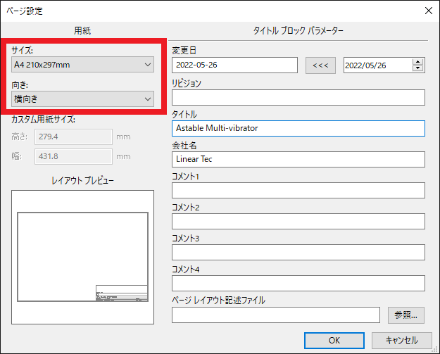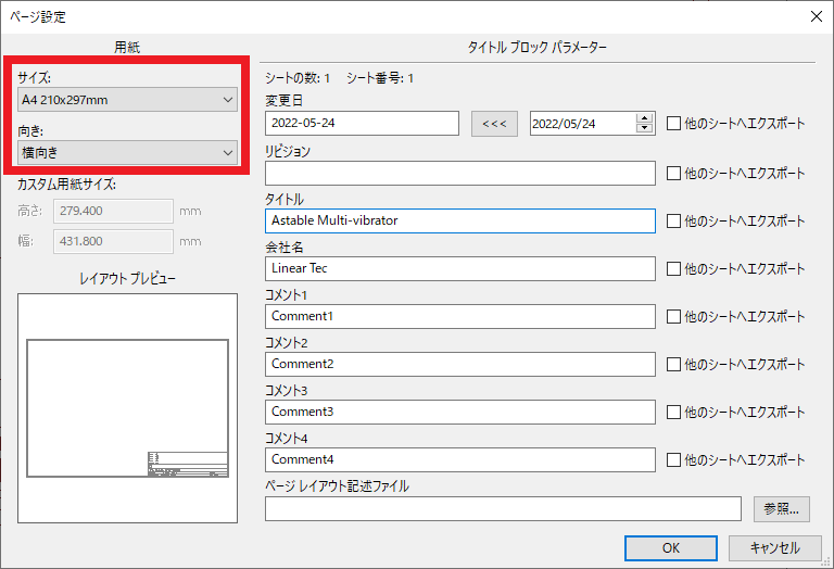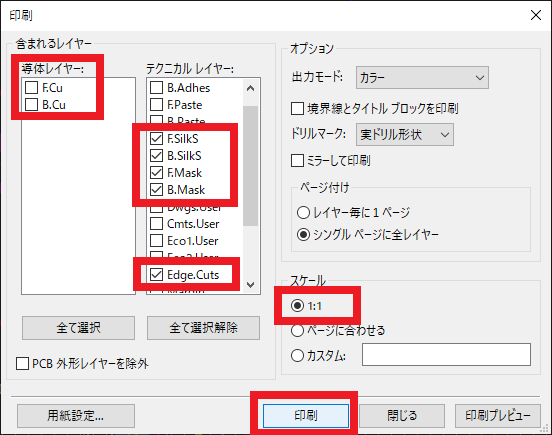 図126の画面が表示されるので,印刷するレイヤを選択します.ベタがある場合は銅箔レイヤの“F.Cu”と“B.Cu”のチェックを外したほうが見やすい図面になります(DRCをクリアしているならば電気的な配線は問題ないはずだが,本当は配線パターンだけでも印刷した方が良い).あとは,出図データに含める“F.SlikS”,“B.SilkS”,“F.Mask”,“B.Mask”,“Edge.Cuts”にチェックを入れます.また,「スケール」は“1:1”にします.