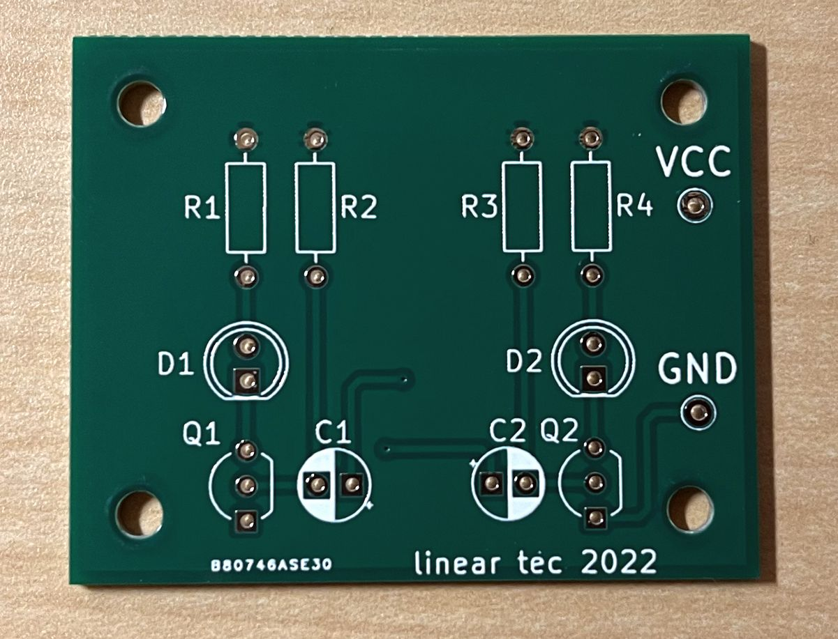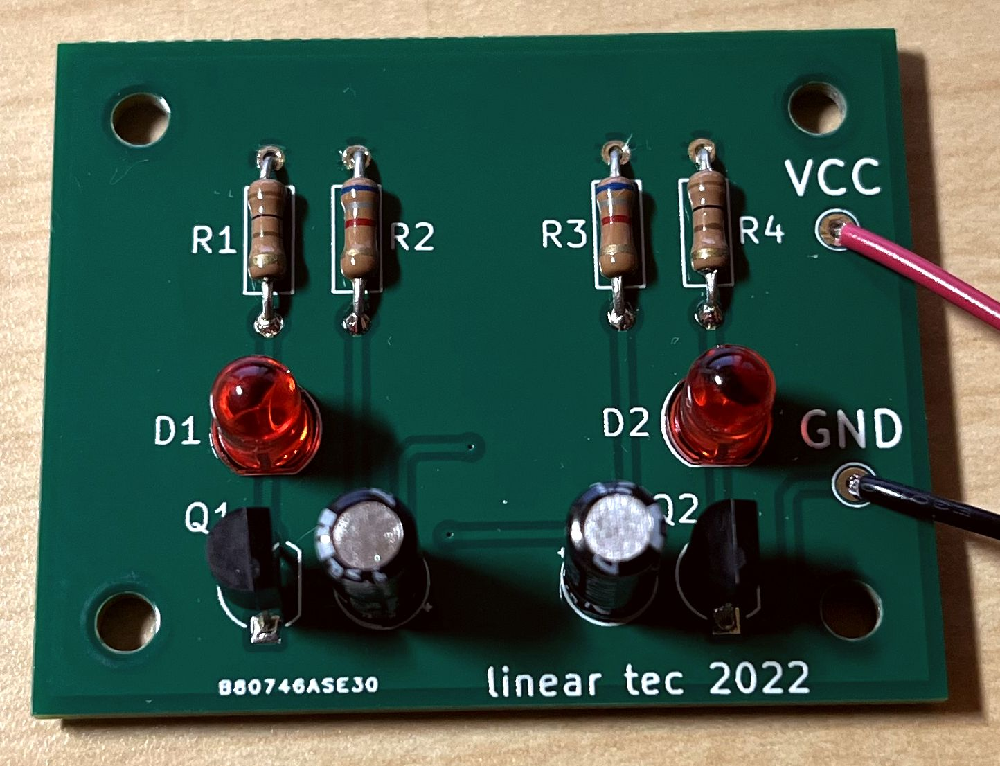 上式より,今回設計した無安定マルチバイブレータの動作周期はおよそ0.5秒であり,約2 HzでLEDが点滅することがわかりました.