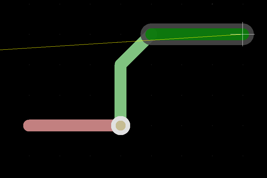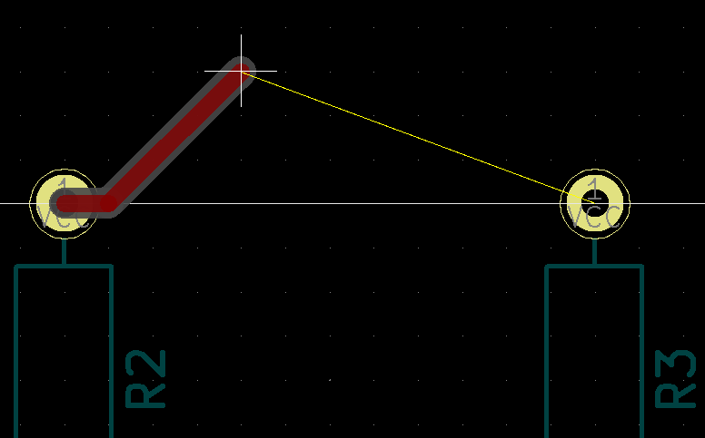 部品どうしの配線を行うときは, [x] キーを押してから部品のパッドをクリックします.すると,その地点が配線パターンの始点になると同時に,配線に「ネット名」が付与されます.例えば,図103のように“VCC”に接続する抵抗のパッドをクリックするとその配線自体のネットが“VCC”になり,他の“VCC”のネットから黄色のラッツが伸びるようになります.