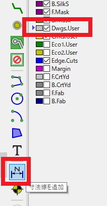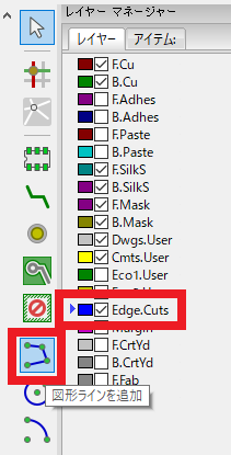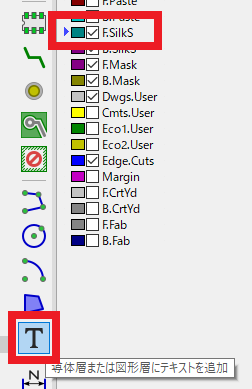 シルクで新しく文字や図形を描いても結構です.文字を入力するなら,図106のように“F.SlikS”(裏面なら“B.SilkS”)レイヤを選択してから「導体層または図形層にテキストを追加」のボタンをクリックします.