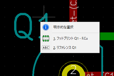シルクや配線などが画面上で重なっている時は,編集時に図107のような確認表示が出ることがあります.これはエラーではないので,選択したい対象をクリックすればそのまま編集できます.