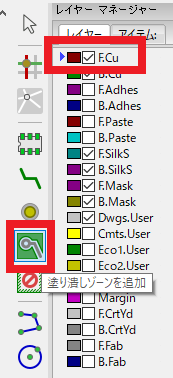 図109に示すように,“F.Cu”レイヤを選択した状態で,画面右側にある「塗り潰しゾーンを追加」ボタンをクリックします.