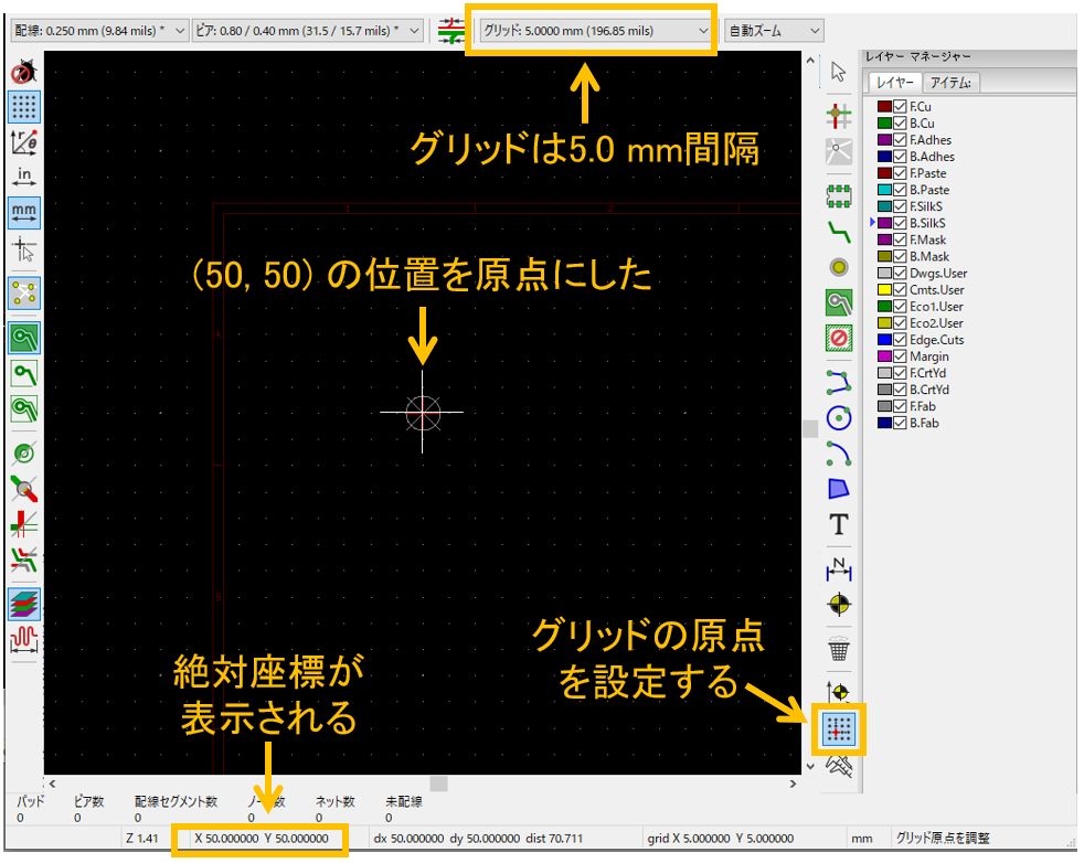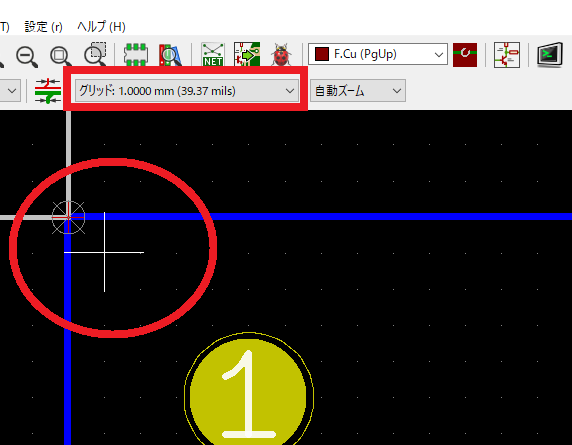 広い面積の銅箔パターンのことを「ベタ」といいます.今回は表層に“VCC”,裏層に“GND”のベタを作ります.この作業を行うときは,グリッド間隔を“1.0 mm”に設定しておくと楽です.