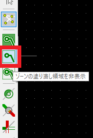 ベタのせいで各部品のフットプリントやシルクが見づらい場合は,図113のように画面左側の「ゾーンの塗りつぶし領域を非表示」ボタンをクリックするとベタの外枠だけが表示されるようになります.