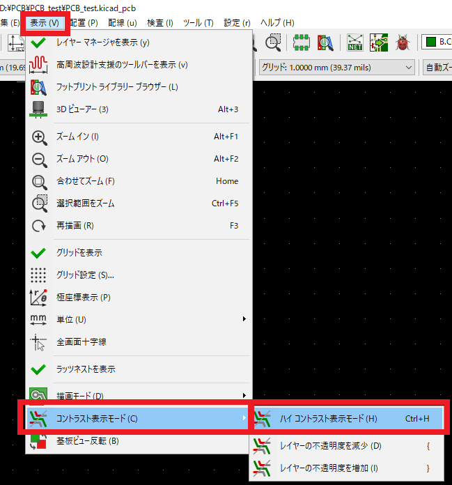 ネットをハイライトするときは,「ハイコントラスト表示モード」に切り替えておくと画面が見やすくなります.図117に示すように,メニュー・バーから [表示] – [コントラスト表示モード] – [ハイコントラスト表示モード] をクリックします.