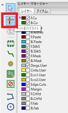 複雑なプリント基板を設計していると,特定のネットの配線を探したくなることがあります.そのような時は,ネットをハイライトすると作業効率が上がります.