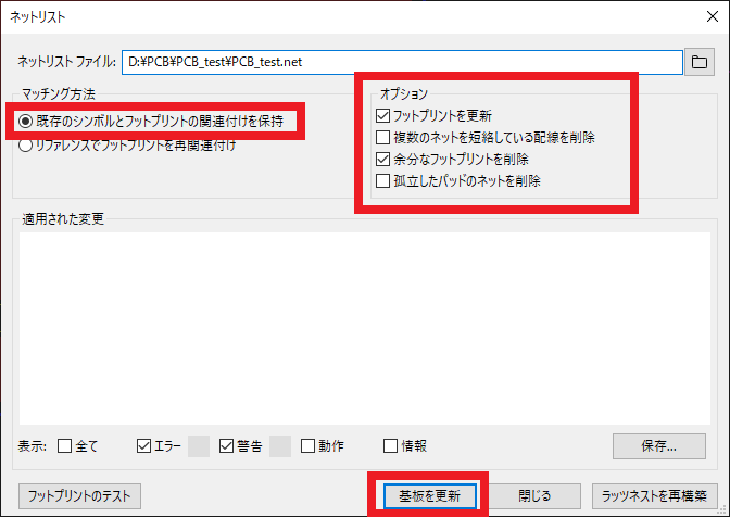 画面上部の「ネットリストをロード」ボタンをクリックして,図120の画面を表示します.ここで「既存のシンボルとフットプリントの関連付けを保持」にチェックが付いていれば,変更箇所以外のフットプリントや配線は保持されます.