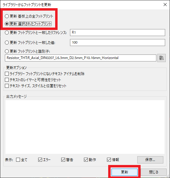 図122の画面が表示されたら,「更新 選択されたフットプリント」を選択して [更新] をクリックします.すると,最新のライブラリにもとづいてフットプリントが更新されます.なお,「更新 基板上の全フットプリント」を選択すれば,すべてのフットプリントを一度に更新できます.