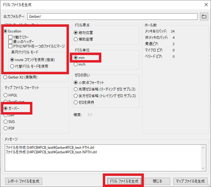 [ドリル ファイルを生成] をクリックすると,指定したディレクトリにドリル・データが保存されます.今回の設定だとメッキあり貫通穴(PTH)用のドリル・データと,メッキなし貫通穴(NPTH)用の合計2つのドリル・データが出力されます.