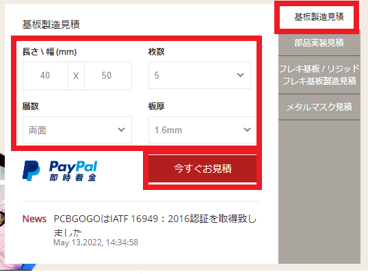 PCBGOGOのトップページ(https://www.pcbgogo.jp/)にアクセスすると,図133のような入力欄が表示されます.「基板製造見積」のタブを選択して,必要事項を入力します.今回は寸法が“40 mm $\times$ 50mm”で,枚数は最小の「5枚」,層数は「両面」,板厚は“1.6 mm”としました.この状態で「今すぐお見積」をクリックします.