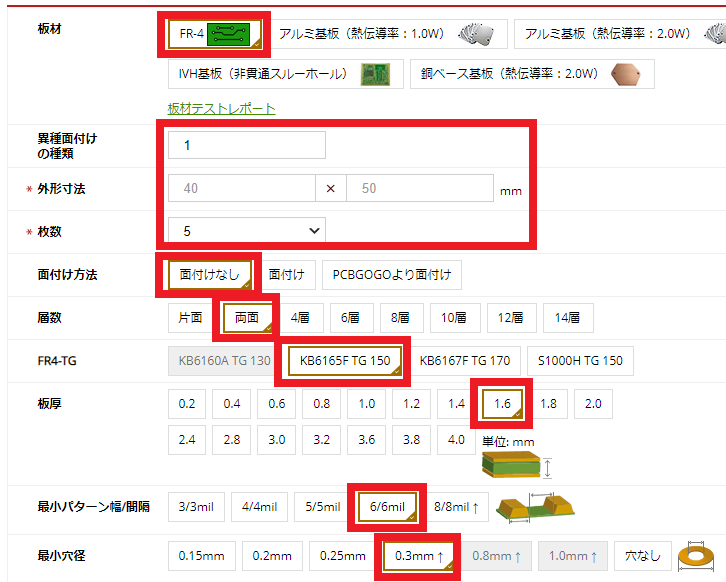 「板材」は標準的な“FR-4”(ガラスエポキシ材)を選びます.「異種面付けの種類」は“1”とします.「面付け」とは,複数の基板レイアウトを大きな1枚の基板に並べて製造することを指します.面付けしたい場合はこの数値を設定してください.「外形寸法」はさきほど設定したとおり“40 mm $\times$ 50 mm”,「枚数」は「5枚」とします.「面付け方法」は「面付けなし」を選びます.層数は「両面」です.“FR4-TG”は最も小さい“TG 150”のグレードを選びました.“TG”とは“Glass Transition Temperature”(ガラス転移温度)の略で,数値が大きいほど高温耐性があります.板厚は標準的な“1.6 mm”としました.