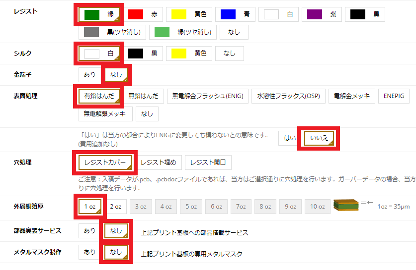 「穴処理」の項目は「レジストカバー」を選択します.外層銅箔厚は一般的な“1 oz”(35 um)を選択します.今回は部品の自動実装やリフローを使わないので,「部品実装サービス」は「なし」で,「メタルマスク製作」も「なし」を選択します.